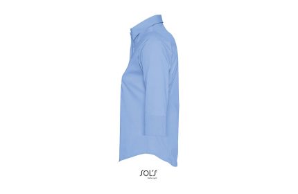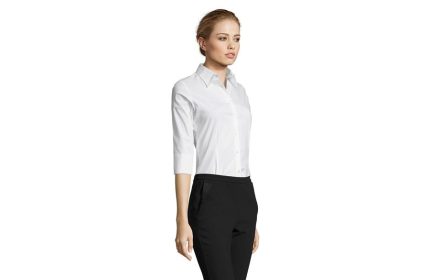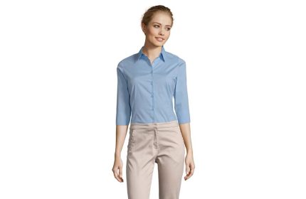 SOL'S EFFECT je ženska košulja sa 3/4 rukavima koja kombinuje moderan stil i ženstveni kroj. Izrađena od POPLIN STRETCH materijala od 140 g/m² (97% pamuk i 3% elastin), pruža udobnost i slobodu pokreta zahvaljujući elastičnom sastavu. Kroj koji prati liniju tela naglašava eleganciju, dok kragna sa jednim dugmetom i manžetne sa mogućnošću podešavanja doprinose praktičnosti i urednom izgledu. Savršen izbor za poslovne prilike i promotivne aktivnosti.