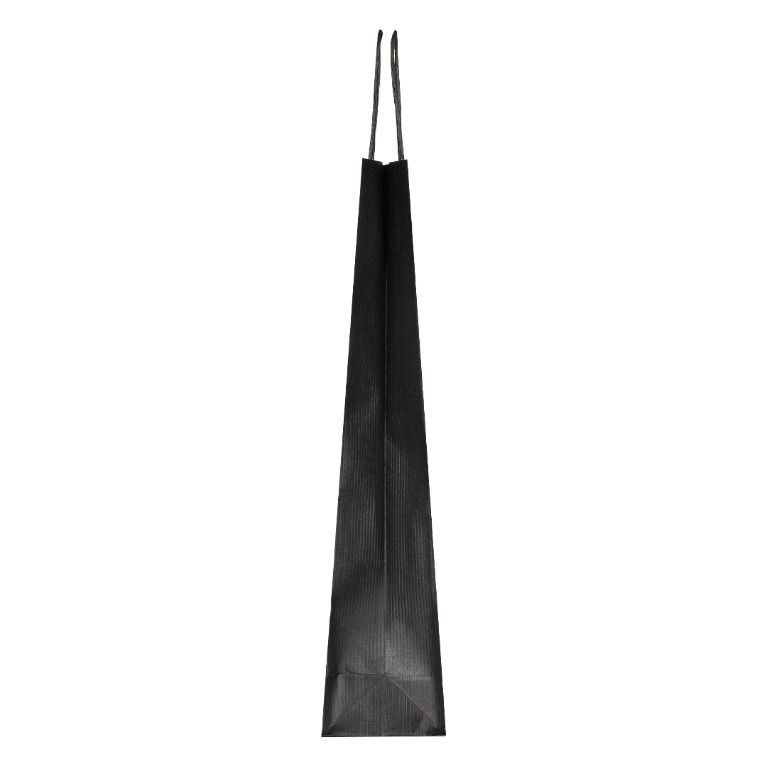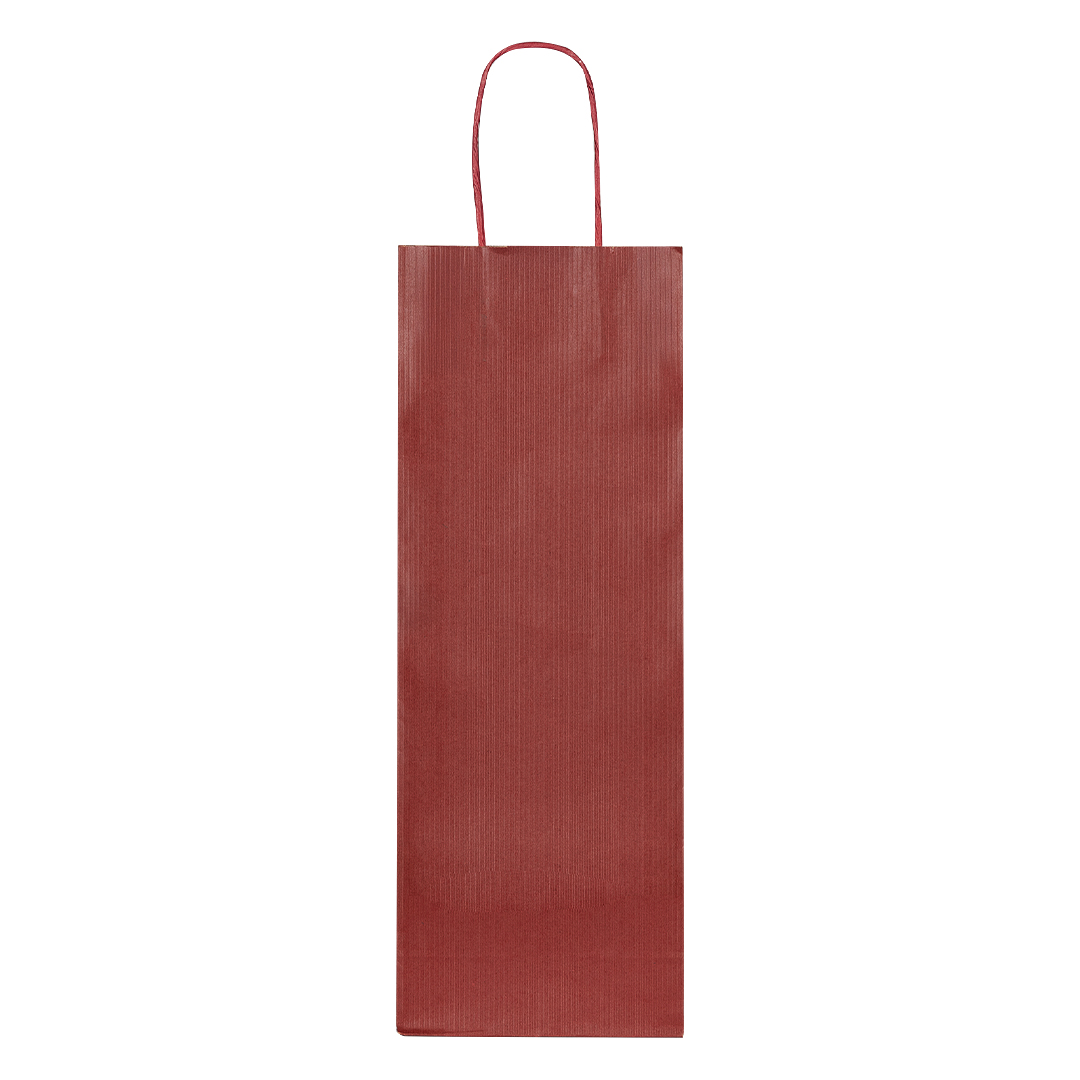 Papirna poklon kesa za flašu • Materijal: kraft papir 120 g/m2 • Diskretna prugasta tekstura • Pletene papirne ručke • Ojačano dno • Pogodna za vino i poklon pakovanja • FSC sertifikat