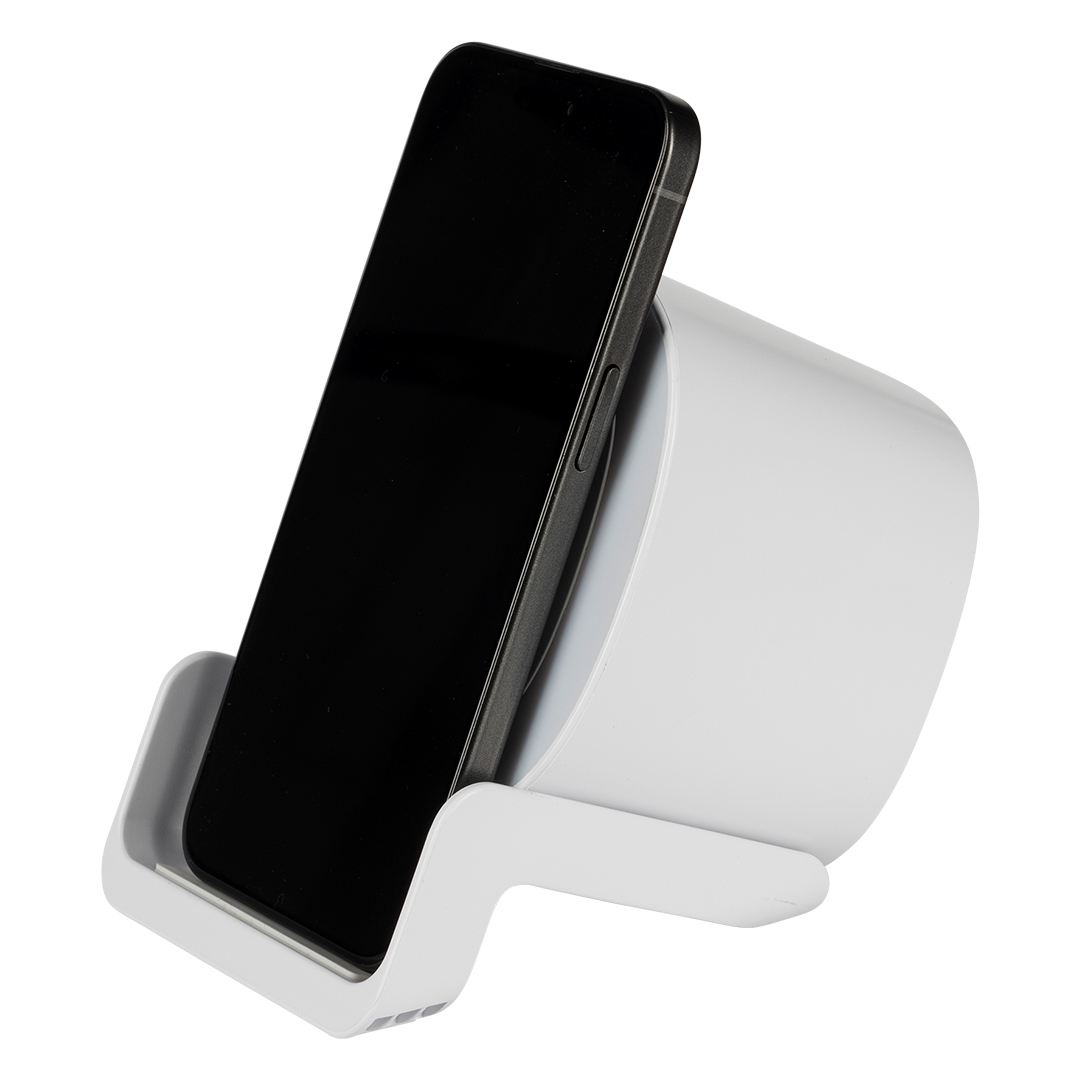 Bežični zvučnik sa integrisanim bežičnim punjačem, dizajniran kao funkcionalan promotivni proizvod za kancelarije i radne stolove. Kombinuje reprodukciju zvuka snage 5 W i bežično punjenje do 15 W, omogućavajući istovremeno punjenje telefona i uživanje u muzici. Poseban vizuelni efekat pruža light-up logo, koji dodatno ističe brend tokom upotrebe. Isporučuje se u poklon kutiji sa uključenim kablom za punjenje.