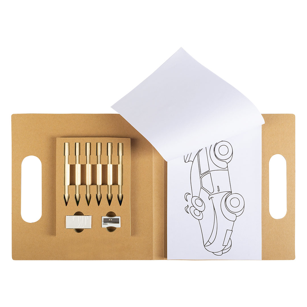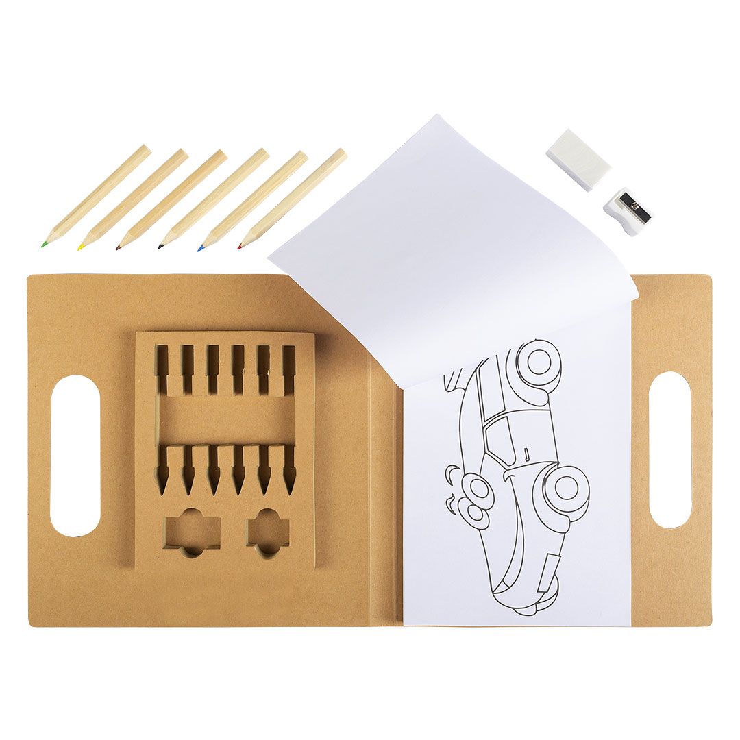 Set za bojenje • 20 listova sa motivima • 6 bojica • Zarezač i gumica • Kartonska fascikla sa ručkom • Pogodno za decu i promotivne aktivnosti