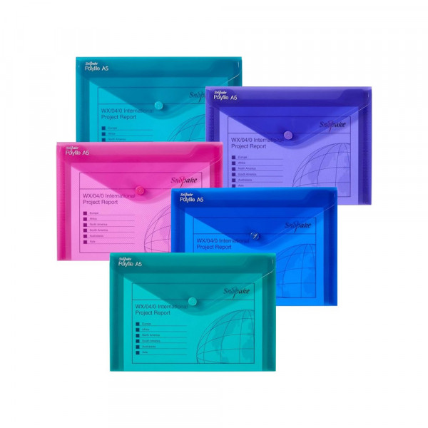 Premium fascikla pismo sa zatvaranjem na dugme. Snažan polipropilenski materijal sa atraktivnim reljefom. Mix popularnih boja. 1 x Plava, 1 x Zelena, 1 x Roza, 1 x Ljubičasta, 1 x Tirkizna. Praktičan sistem indeksiranja, jedinstven za Snopake fascikle.