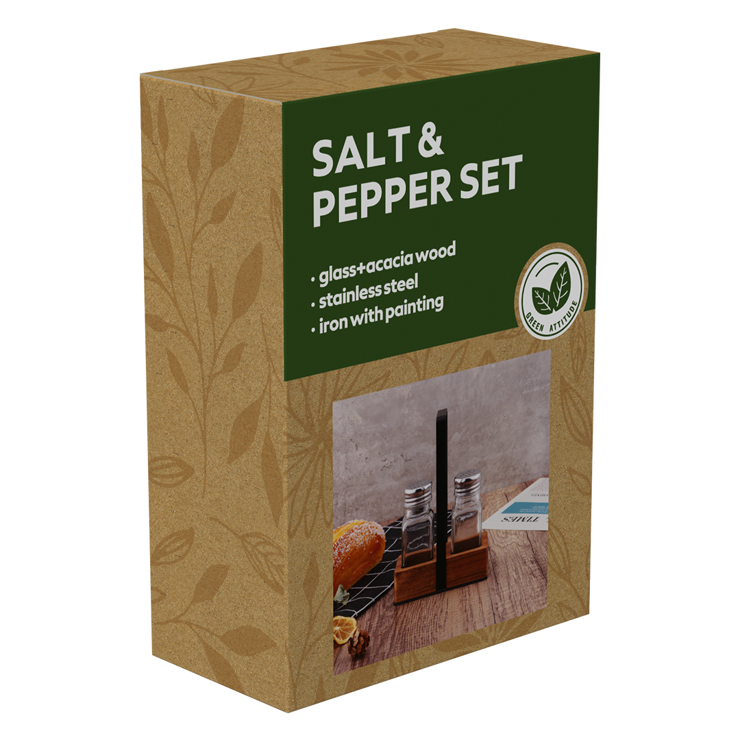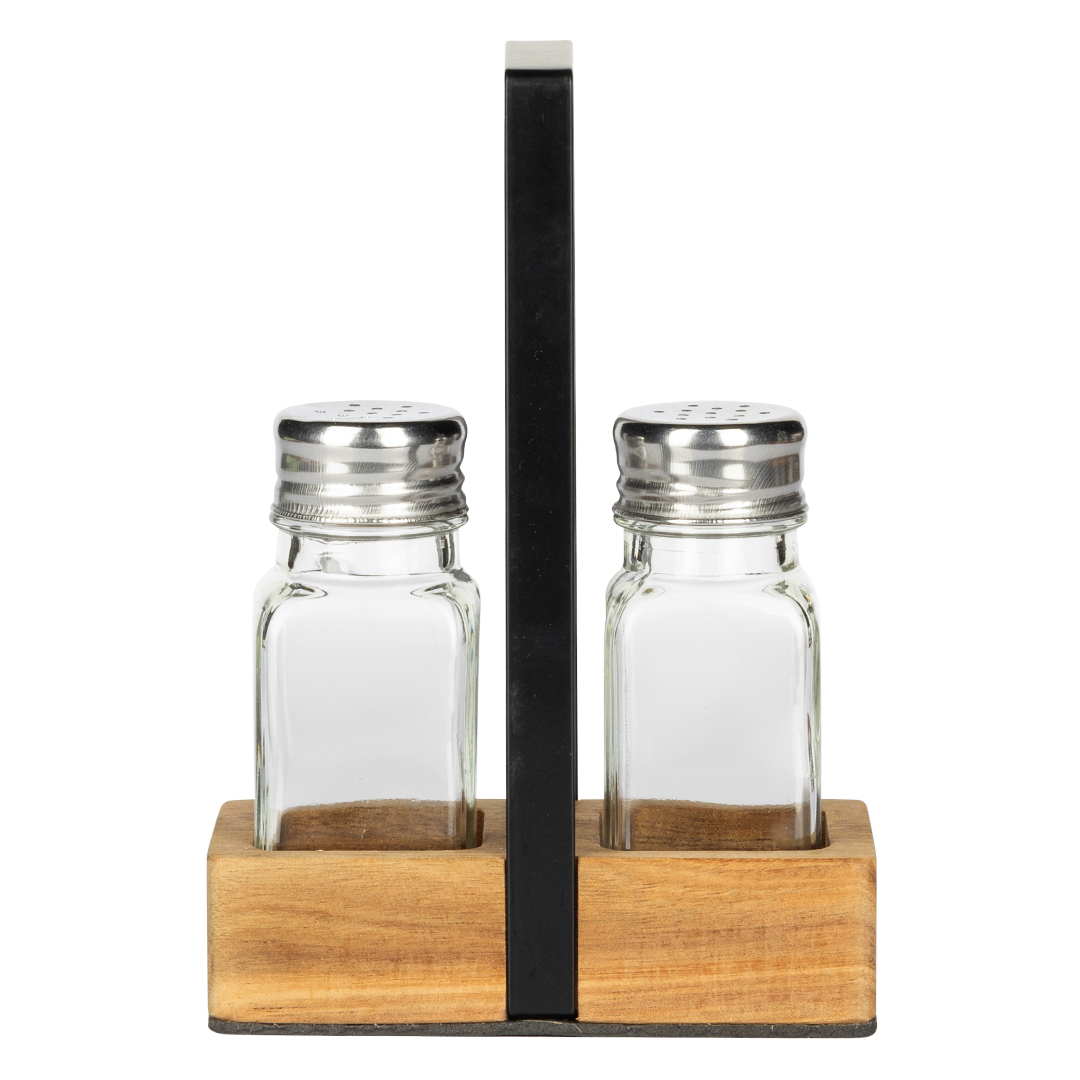 Materijal: drvo (postolje), staklo (posude) • Sadržaj seta: drveno postolje i posude za so i biber • Poklon pakovanje