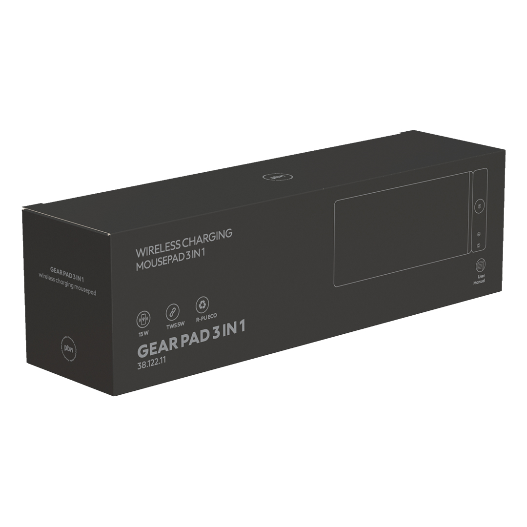 GEAR PAD 3IN1 je funkcionalna podloga za kompjuterskog miša sa integrisanim bežičnim punjačem snage 15W, namenjena modernom kancelarijskom i poslovnom okruženju. Zahvaljujući magnetnom sistemu, deo sa punjačem može se lako odvojiti od podloge, što omogućava fleksibilnu upotrebu u zavisnosti od potreba korisnika. Izrađena je od kvalitetne eko kože koja obezbeđuje prijatan osećaj pri radu i uredan, profesionalan izgled radnog prostora. Proizvod je pakovan u luksuznu crnu kutiju i predstavlja praktičan promotivni proizvod i poslovni poklon pogodan za brendiranje.