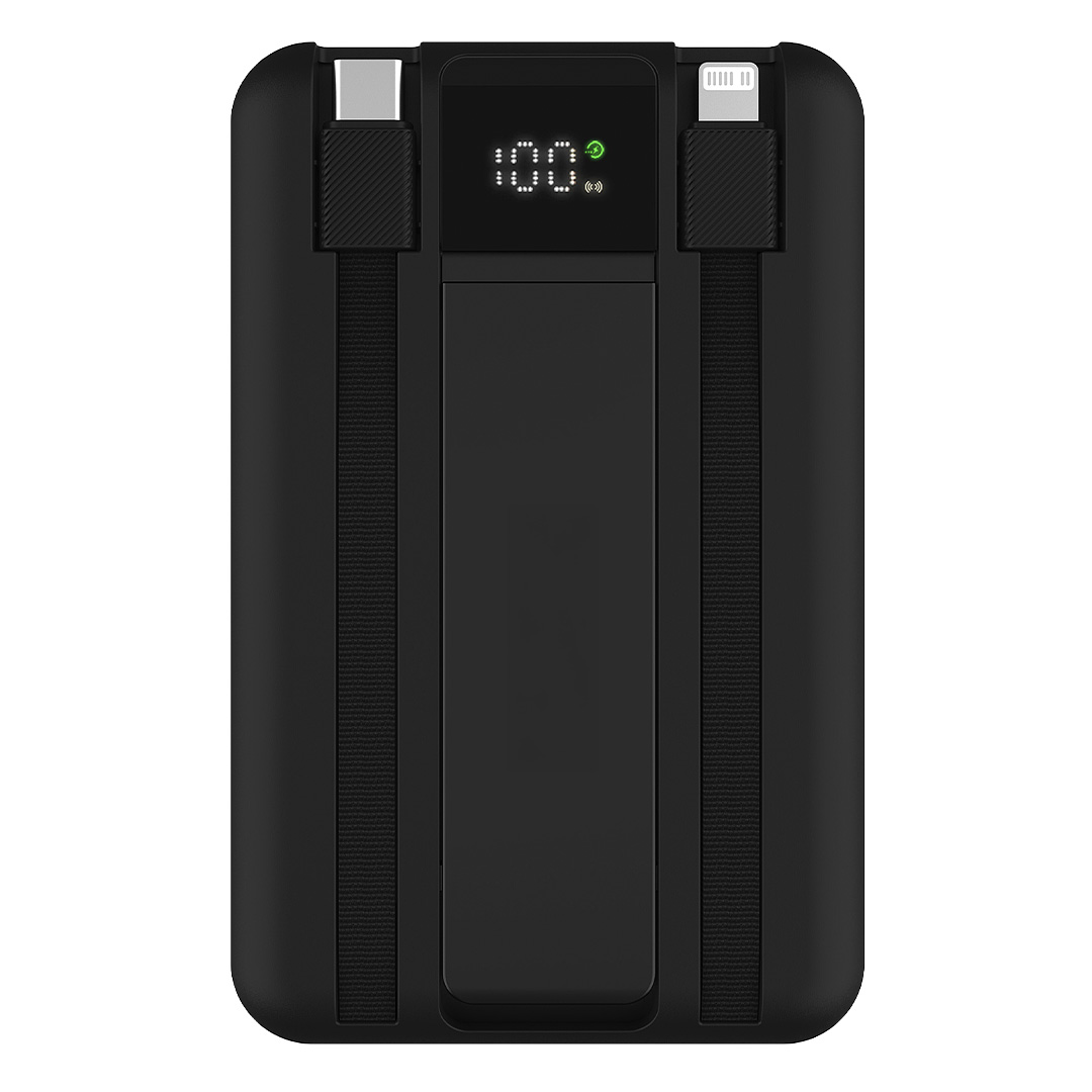 MISTIK 10PD magnetni power bank sa ugrađenim kablovima predstavlja napredno i svestrano rešenje za punjenje mobilnih uređaja. Opremljen je integrisanim postoljem za telefon, što omogućava praktično korišćenje tokom punjenja, gledanja sadržaja ili video poziva.
