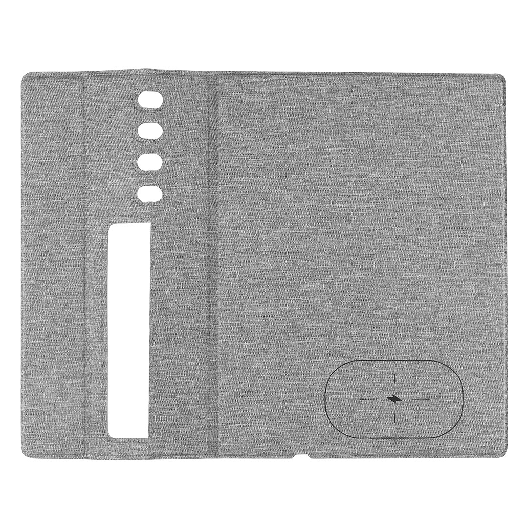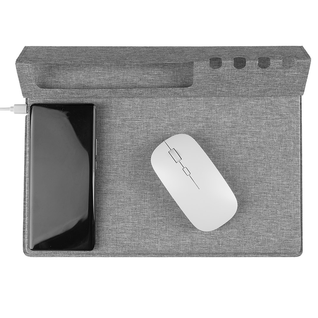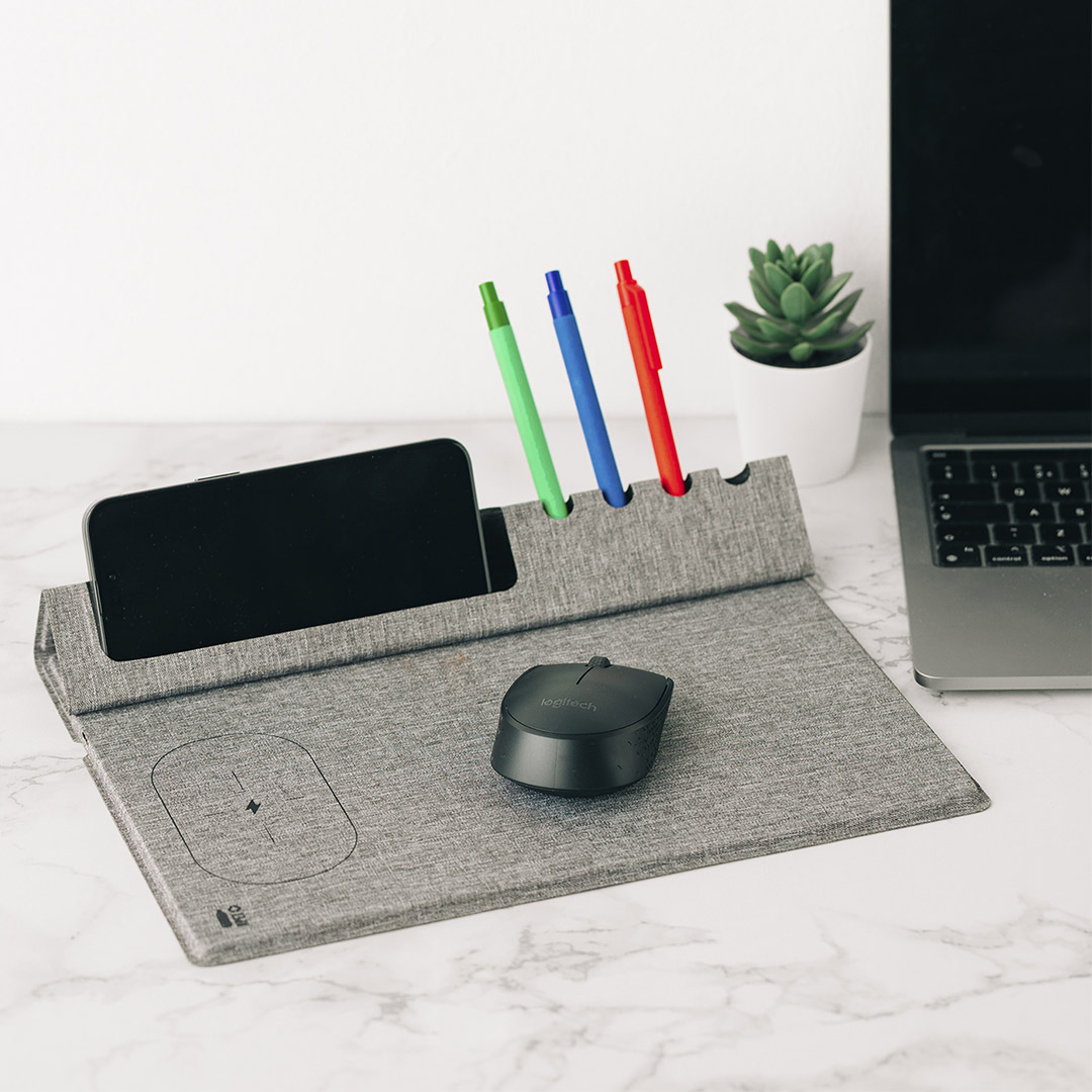 Podloga za kompjuterskog miša • Bežični punjač 15W • Materijal: RPET • Preklopni deo sa držačem za telefon i olovke • Funkcionalna organizacija radnog prostora • Pakovano u kutiju • Pogodno za brendiranje