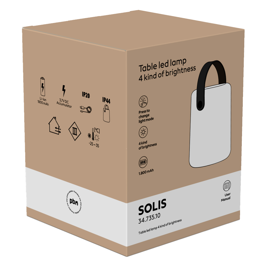 SOLIS LED lampa dizajnirana u obliku fenjera predstavlja praktično i dekorativno rešenje za spoljašnje i unutrašnje prostore. Zahvaljujući vodootpornoj konstrukciji i ručki od eko-kože, pogodna je za terase, bašte, kampovanja, beach barove, restorane i event prostore. Kombinacija prenosivosti i ambijentalnog osvetljenja čini je atraktivnim promotivnim proizvodom za hospitality sektor i sezonske kampanje.