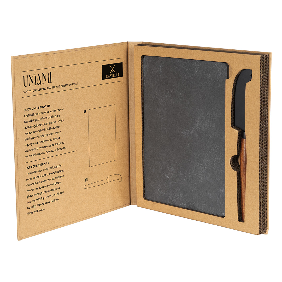 Nož od nerđajućeg čelika sa drvenom drškom pruža dobar balans i udobnost pri upotrebi, dok se estetski uklapa uz kamenu podlogu. Set dolazi u poklon pakovanju sa diskretnom štampom na spoljašnjoj strani, pri čemu se ambalaža može dodatno personalizovati u skladu sa potrebama kampanje.